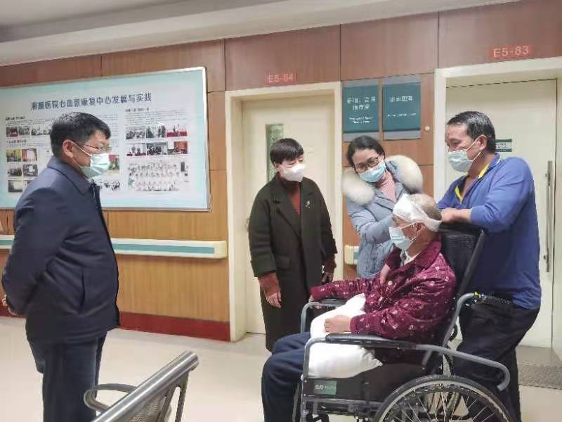 2022年新春佳节来临之际,公司党委书记罗成翼、董事长童小娇、副董事长周发明率队前往湘雅附一走访慰问章醇同志,校工会、乐天使、二附小主要负责人陪同前往。