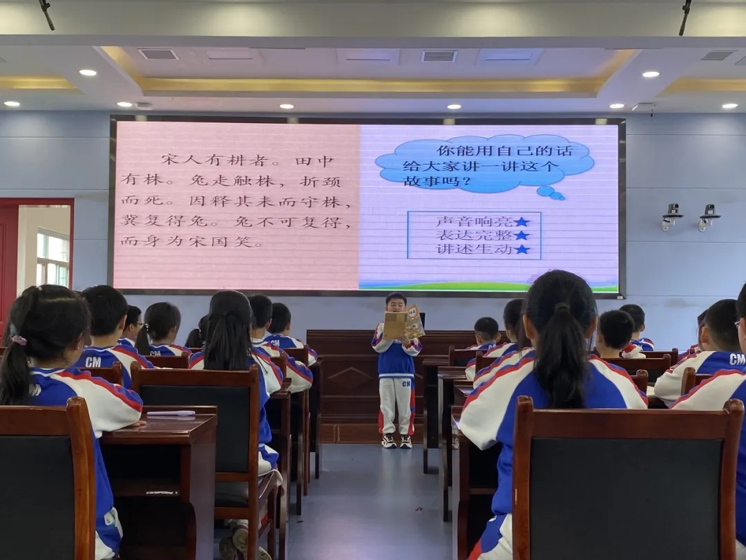 《守株待兔》的课堂里,巫俐霖老师融合了范读、点读、齐读、自由读等多种方式,从节奏、内容及情感等方面让员工整体把握文意。在讲解重点字词“耒”“释”“走”时,贯穿文言文的阅读技巧:“读注释”“看插图”“扩词法”;并注重发散员工思维,引导员工利用所学知识“举一反三”。巫老师以“讲故事”环节收尾,采取同桌互讲、生上台讲等方法让员工呈现自己对文本的理解,激发了同学们学习文言文的兴趣,现场课堂氛围活跃。