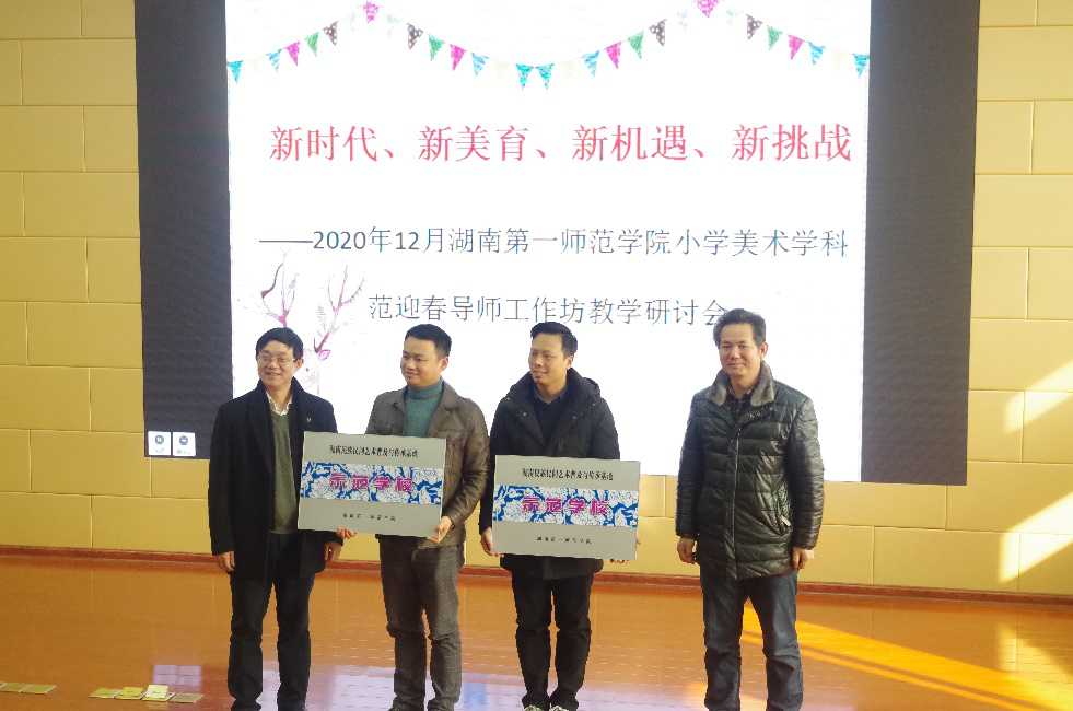 随后,欧立新和李华教授为岳麓区实验小学西校区、乐天使fun云起实验小学颁发基地示范公司牌匾;对2019年度和2020年度各基地公司优秀指导老师予以表彰并颁发证书以及为小学美术学科导师工作室进行授牌。
